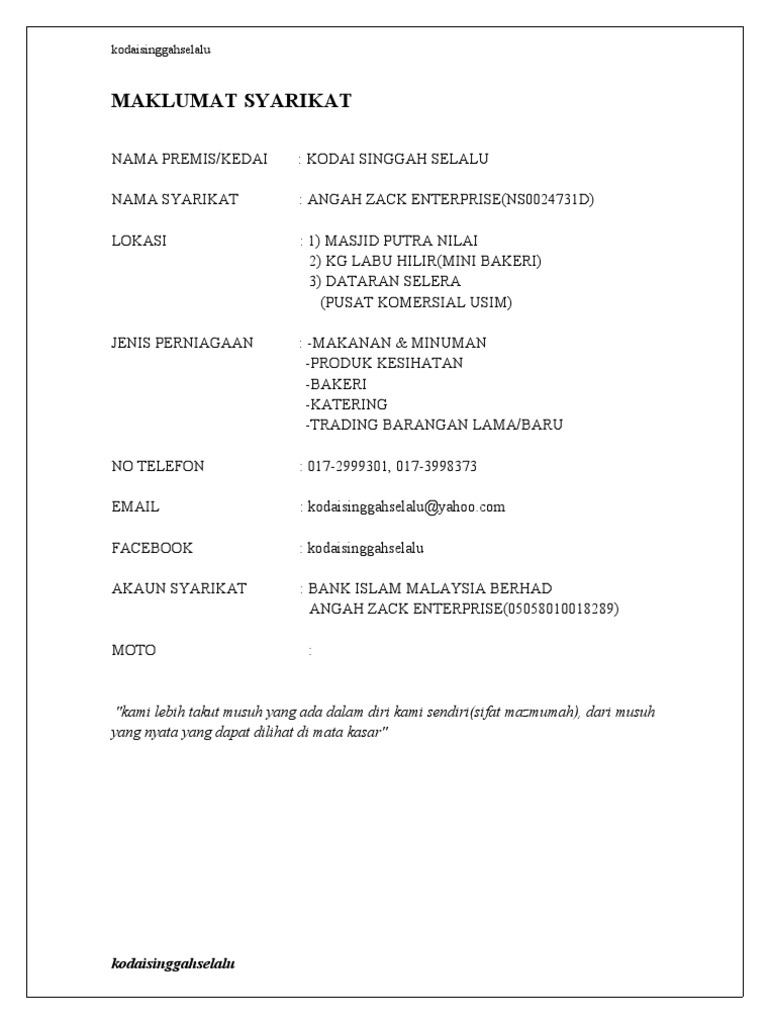 House decorating is not a huge offer if you can chasing down very easy ideas suitable for your spending plan. Company profile company profile cv. Profil syarikat zuzunie enterprise (88723) pengeluar produk makanan ringan & kuih tradisional. Memulakan perniagaan sekitar tahun 1997, dengan hanya bermodalkan sekitar rm 2,600.00, serta 6 orang pekerja. Ini adalah contoh profile syarikat bagi bidang kecantikan.